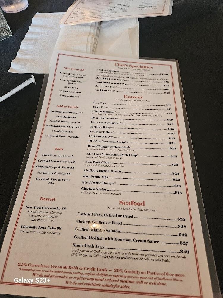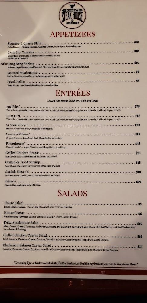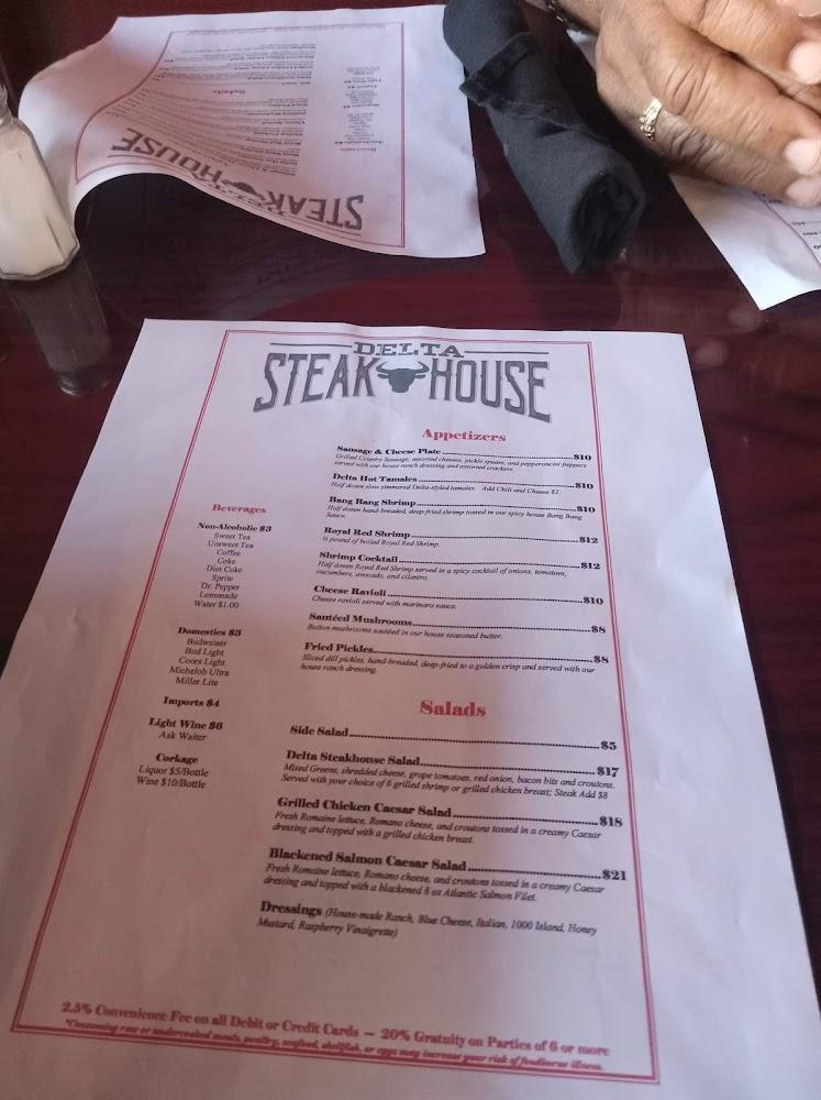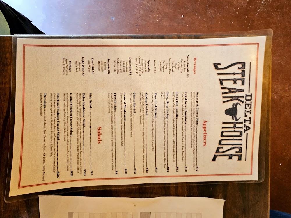 Delta Steakhouse offers a diverse menu that suits various tastes. The star attraction is the hand-cut Black Angus steaks, cooked to perfection. Options include aged ribeye, filet mignon, and custom cuts for those seeking variety. The seafood selection, including catfish and shrimp, promises freshness and flavor. Appetizers like fried cheese ravioli and stuffed hot tamales prepare diners for an indulgent experience. Salads are another highlight, from caesar to a hearty Delta steakhouse salad. Sides are plentiful, featuring favorites like grilled asparagus and colossal baked potatoes. Desserts include fan favorites like New York cheesecake and turtle cheesecake. The drink menu boasts a variety of wines and craft beers to pair beautifully with any dish. Additionally, the kids’ menu ensures that even the youngest diners find something to enjoy. This thoughtful menu makes Delta Steakhouse a top choice for families and friends.